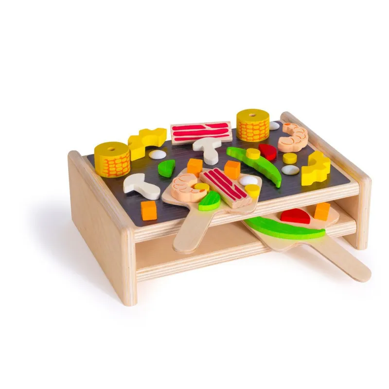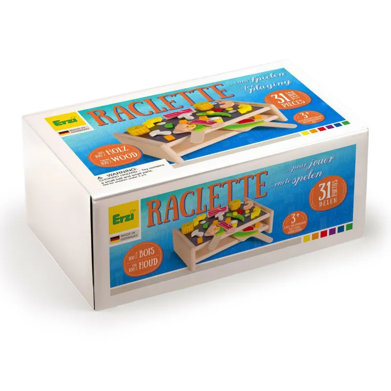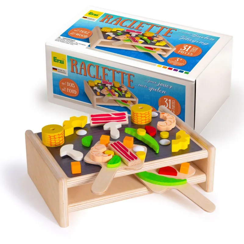 Im Erzi Raclette gibt es allerlei Zutaten, die durch ein wenig Fantasie jedes Mal eine neue Variaton auf den Teller zaubern. Ob Paprika, Möhrchenwürfel oder Cheddar, ob Sahnekleks oder Mozzarella, ob Avocado, Paprika, Gurke, Mais, Käse oder Paprika – variantenreich wie ein echtes Raclette, und mit jeder Menge Spielwert. Das Erzi Raclette – ein Muss für jede Kinder-Küche.