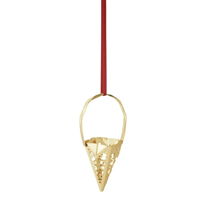 Dieses tütenförmige Weihnachtsornament ist mit 18 Karat Gold plattiert und bringt einen warmen Glanz in Ihr Zuhause. Die goldene Spitztüte ist mit Spitzenmustern verziert und zeigt das diesjährige Band in Off-White sowie das klassische rote Band. Das Stück wurde von Sanne Lund Traberg als Teil der Weihnachtssammelkollektion 2022 entworfen.