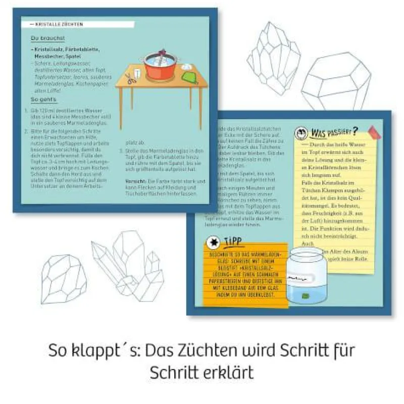 ACHTUNG. Nicht geeignet für Kinder unter 10 Jahren. Benutzung unter Aufsicht von Erwachsenen. Enthält eine Chemikalie, die eine Gefahr für die Gesundheit darstellt. Lies die Anweisungen vor Gebrauch, befolge sie und halte sie nachschlagebereit. Bringe die Chemikalie mit keiner Stelle des Körpers in Kontakt, besonders nicht mit dem Mund und den Augen. Halte kleine Kinder und Tiere beim Experimentieren fern. Bewahre den Experimentierkasten außer Reichweite von Kindern unter 10 Jahren auf.