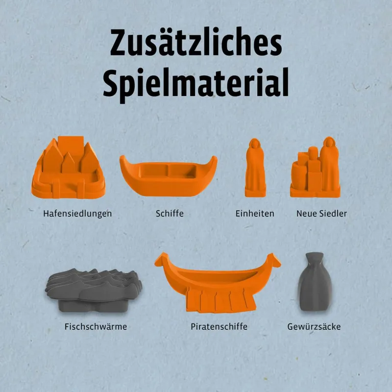Inhalt: 24 Gewürzsäcke, 4 Baukostenkarten, 10 Zip-Tüten, 1 Spielanleitung, 24 Landfelder, 11 Meerfelder, 14 Rahmenteile, 12 Zahlenchips, 6 Piratenlager, 6 Missionskarten, 76 Münz-Plättchen, 10 Sortierkarten, 88 farbige Spielfiguren, 6 Fischschwärme