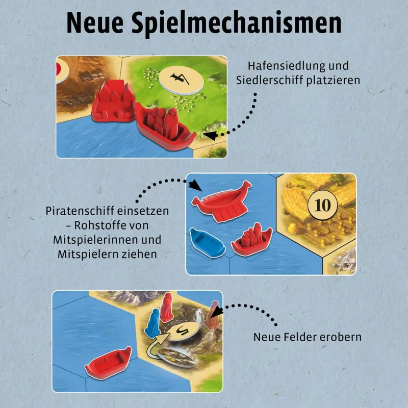 Die Erweiterung selbst ist modular aufgebaut. In einem Einführungsspiel, das nur wenige neue Regeln hat, lernt man insbesondere die Bewegung der Schiffe, den Transport von Siedlern und das Entdecken und Besiedeln der unbekannten Inselwelt kennen. In weiteren Szenarien werden Stück für Stück die Missionen eingeführt, so dass man von Spiel zu Spiel nur einige neue Spieleelemente (und Regel) erlernt, bis man zu guter Letzt beim Szenario „Entdecker & Piraten“ ankommt, in dem mit sämtlichen Regeln und Missionen gespielt wird.