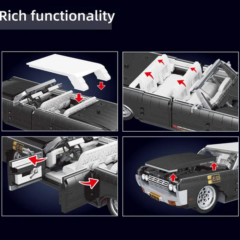 dieses Retro-Automodell besteht aus 1903 Teilen. Es verfügt über ein klassisches Design mit schlanken schwarzen Karosserieteilen und einem abnehmbaren Cabrio-Dach. Die vorderen und hinteren Sitze können zurückgelehnt werden und bieten ein komfortables Interieur. Das Auto enthält einen funktionalen Doppel-Türmechanismus für beide Seiten. Das detaillierte Armaturenbrett, das große offene Cockpit und das aufwendige Äußere machen es zu einem herausragenden Ausstellungsstück für Auto-Enthusiasten und Sammler.