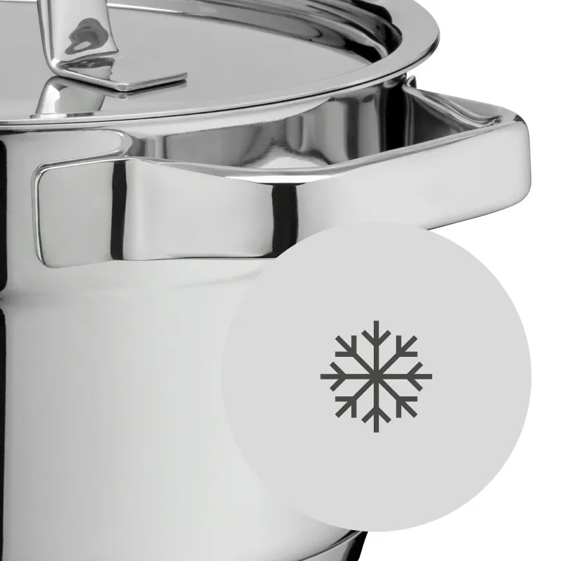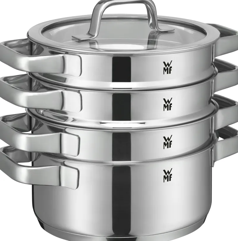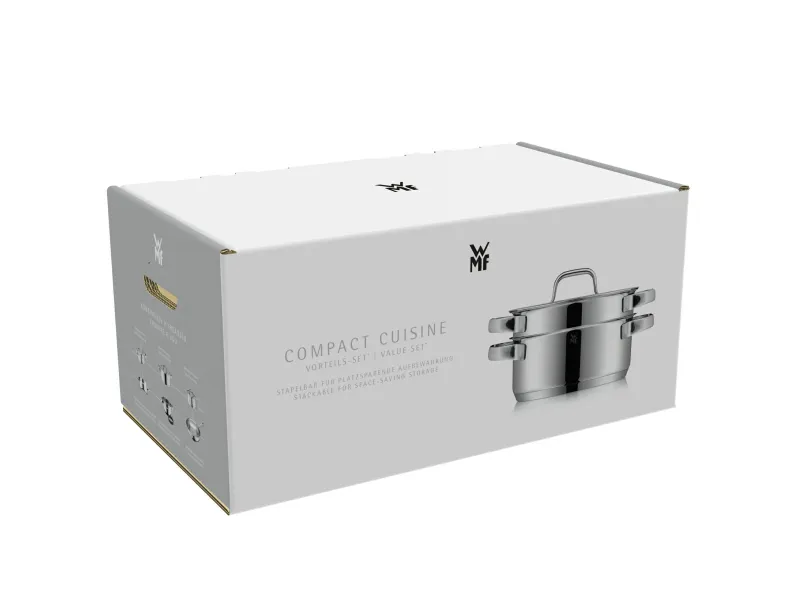 Die Kollektion Compact Cuisine von WMF begeistert mit ihrer einerseits wunderschönen und andererseits besonders kompakten und intelligent-platzsparenden Formgebung, die sogar das Stapeln von bis zu 4 Kochgeschirren desselben Durchmessers ermöglicht. Interne Vergleichstests mit anderen Topf-Sets, Schüsseln und Dampfgareinsätzen von WMF ergaben, dass gestapelte Compact Cuisine Kochgeschirre (ausgenommen Pfannen und Deckel) mit identischen Durchmessern so bis zu 30 Prozent weniger Platz im Küchenschrank benötigen als dies bei anderen Serien der Fall ist. Damit ist Compact Cuisine eine smarte Lösung um Platz zu sparen und in Küchenschränken Ordnung zu halten. Das 5-teilige Compact Cuisine Topf-Vorteils-Set* macht da natürlich keine Ausnahme. Die Töpfe sind dazu aus strapazierfähigem und elegantem Cromargan® gefertigt, verfügen über den energiesparenden TransTherm®-Allherdboden, wärmereduzierende Hohlgriffe und einen breiten Schüttrand zum tropffreien Ausgießen von Flüssigkeiten. Und selbstverständlich sind sie mitsamt der zugehörigen Glasdeckel spülmaschinengeeignet.