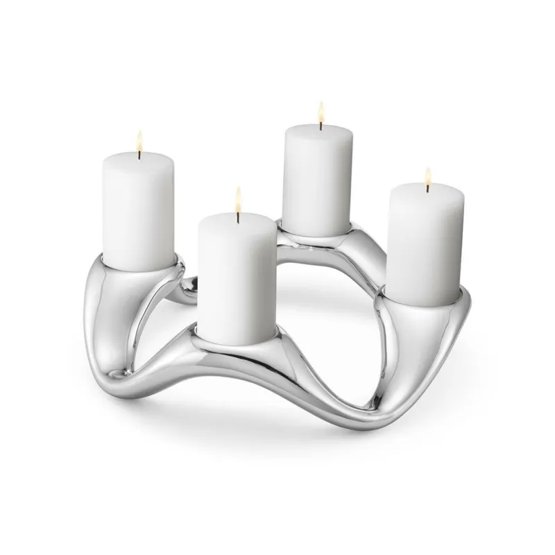 Dieser skulpturale Leuchter aus Edelstahl ist voller fließender Bewegung und ein markanter Tischschmuck, insbesondere wenn das Kerzenlicht auf der sanft gewellten, glänzenden Oberfläche reflektiert wird. Er trägt vier Stumpenkerzen und ist perfekt für die Adventszeit, aber dezent genug für das ganze Jahr.
