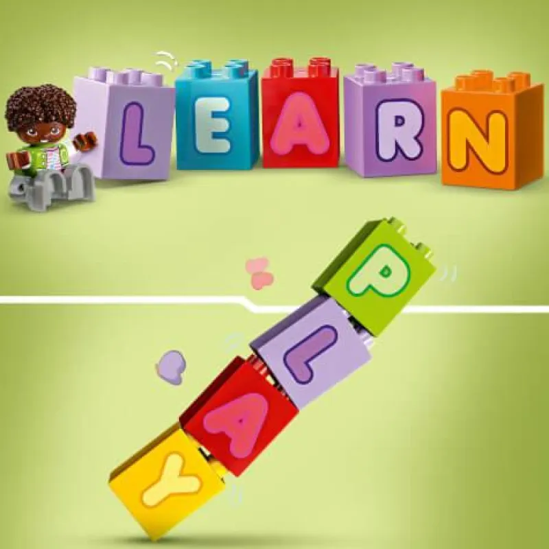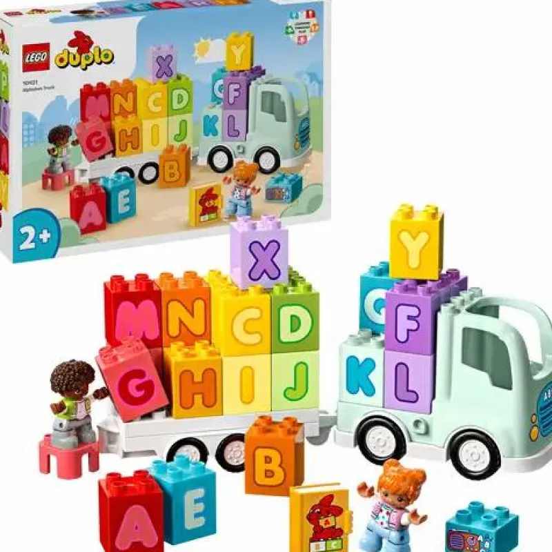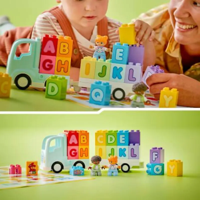 - Lernspielzeug für Vorschulkinder: Beinhaltet einen fahrbaren Spielzeug-LKW mit abnehmbarem Anhänger, 2 LEGO DUPLO Figuren und 26 ABC-Steine