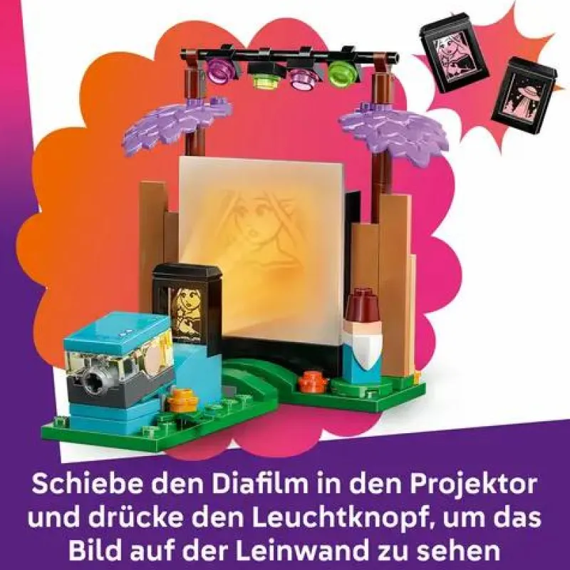 - Spannendes Zubehör für Rollenspiele: Das LEGO Friends Spielzeug kommt mit spannenden Accessoires – ein Projektor mit Leuchtstein (Batterie liegt bei), 2 Dias mit Filmmotiven, 2 Getränke, 2 baubare Sitzsäcke, eine Popcornschachtel und ein Comic-Heft