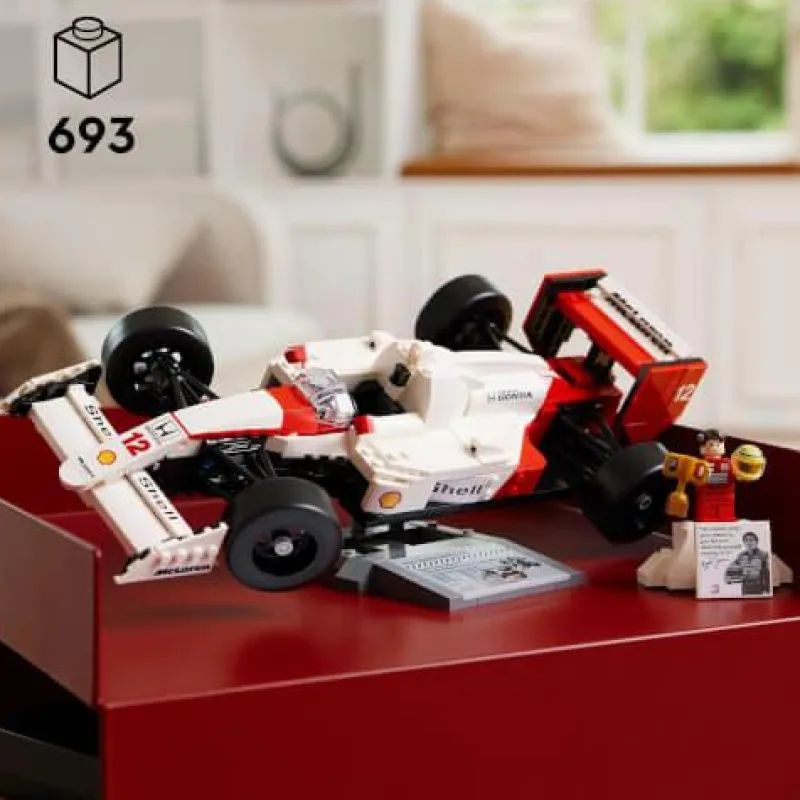 - Heimdekoration für den Schreibtisch: Auf dem Ständer für den McLaren MP4/4 sind Statistiken des Fahrzeugs aufgedruckt. Der Ständer für die Minifigur ist einem Siegerpodest nachempfunden und trägt ein Foto und ein berühmtes Zitat von Ayrton Senna