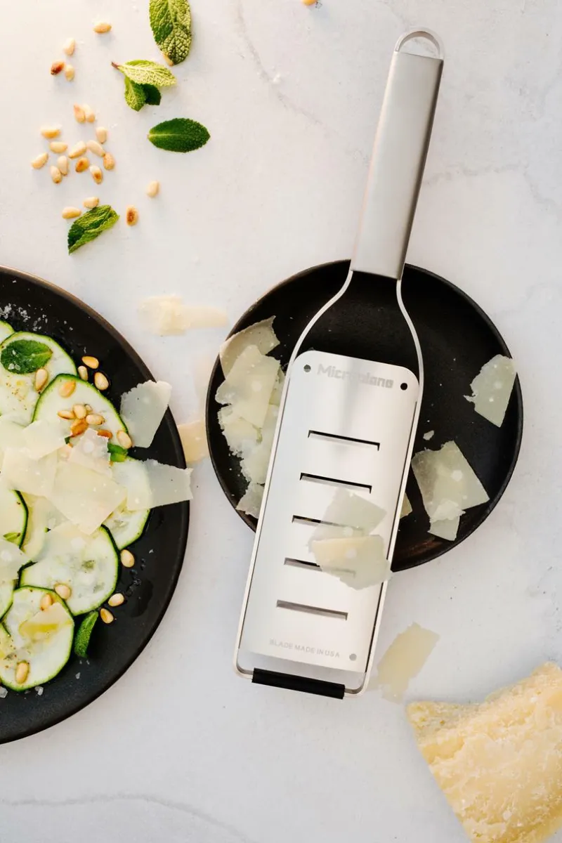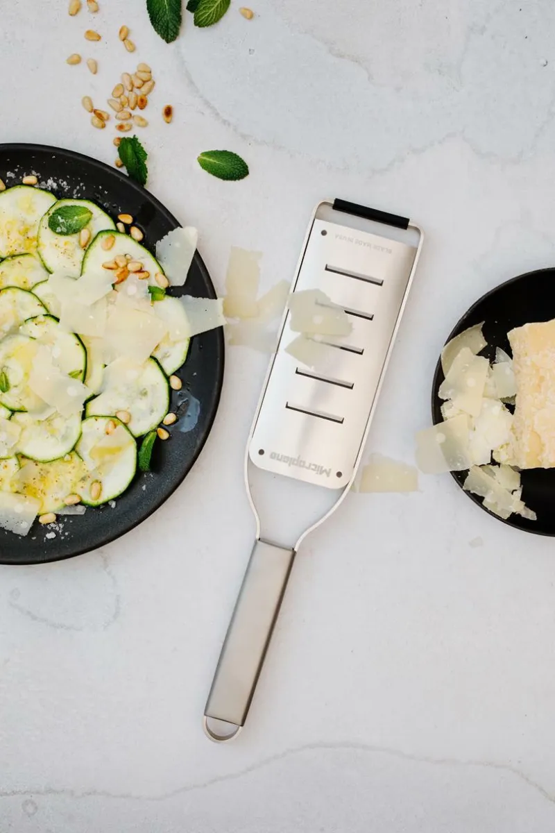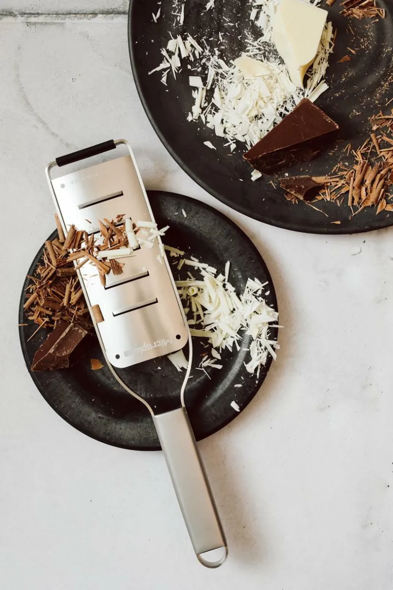 2-Wege-Schneide: Breite, hauchdünne Späne zum Verzieren von Vorspeisen oder Salaten – für Käse, Schokolade, Butter, Zucchini