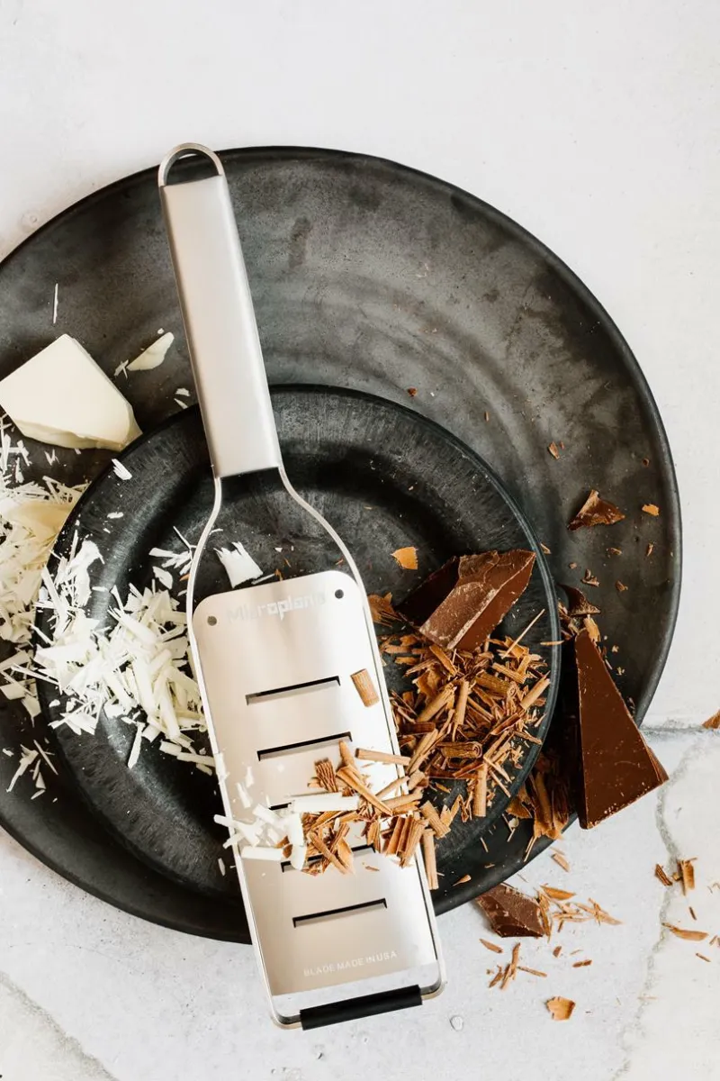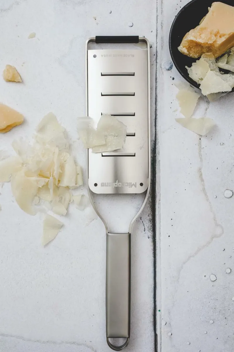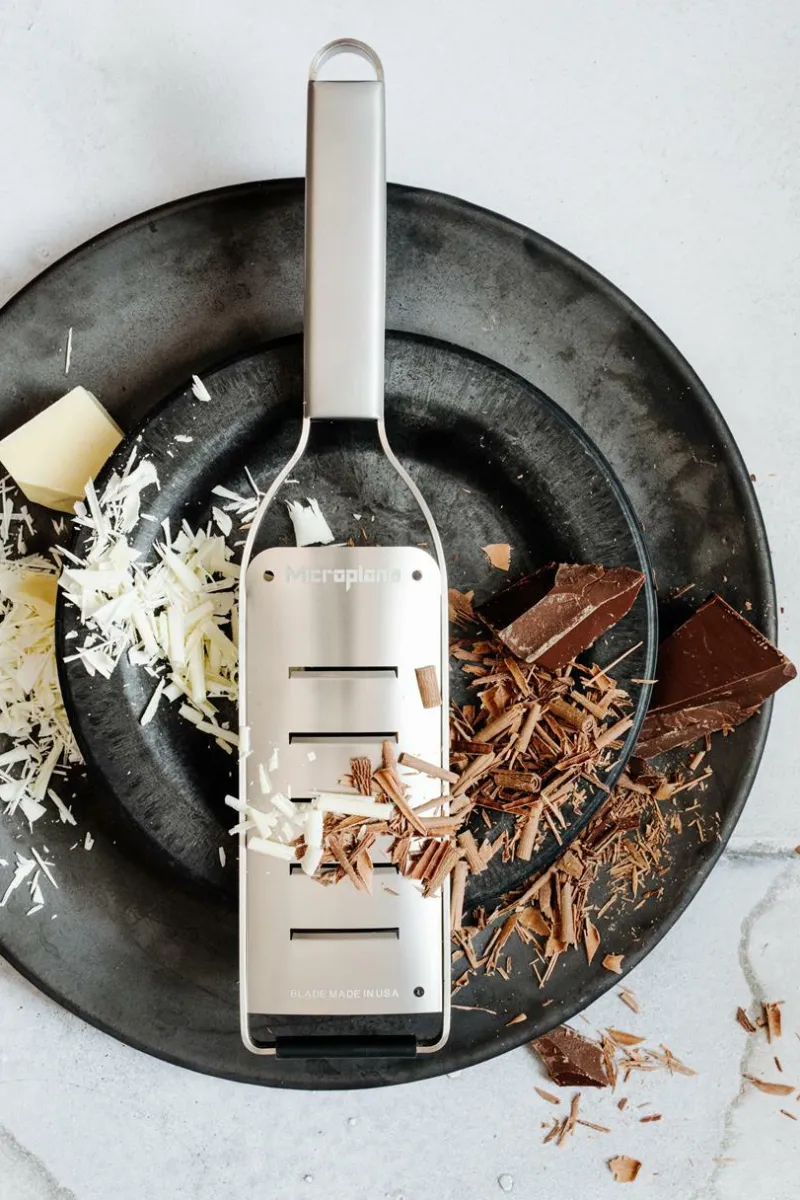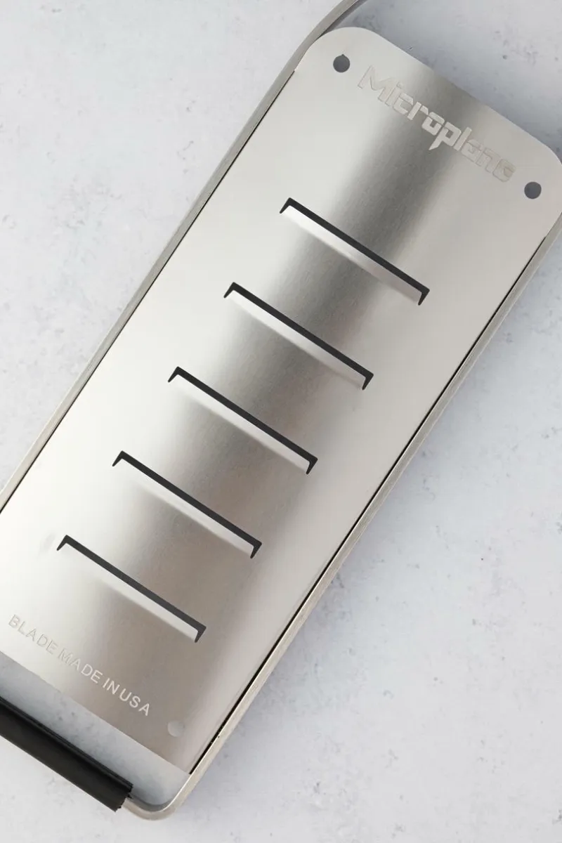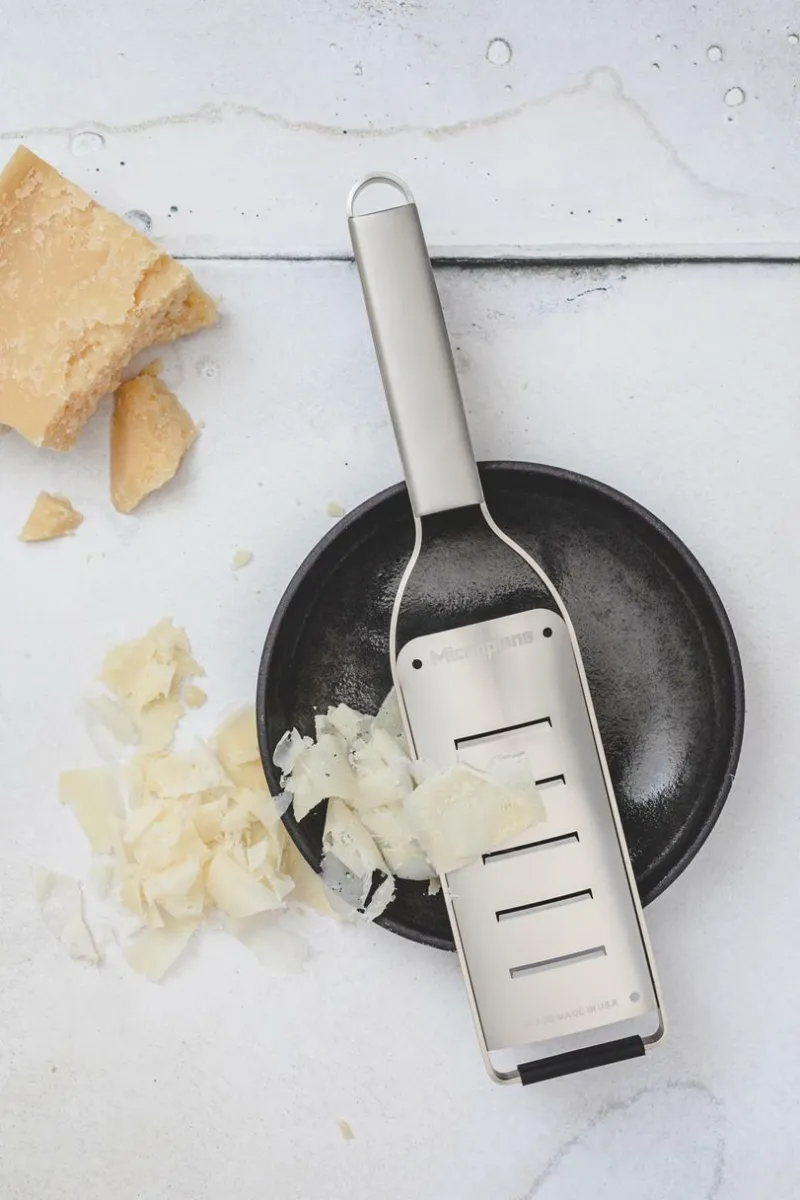Ein klassischer, zeitloser Look aus Edelstahl, inspiriert von Profiköchen und ein Blickfang in jeder Küche. Der rutschfeste Gummifuß sorgt für Stabilität beim Reiben. Mit sechs verschiedenen Klingenarten – Zester, Fein, Grob, 2-Wege-Schneide, Große Raspel und Extra Grob – können sowohl Hobby- als auch Profiköche bei der täglichen Zubereitung von Speisen glänzen.