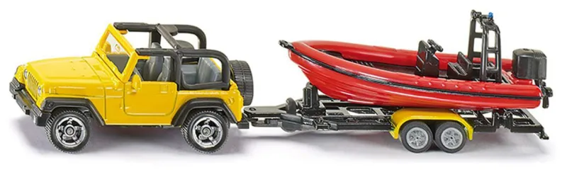 Freizeitspaß und einen Hauch von California Feeling vermittelt die Kombination des offenen Jeep Wrangler mit Motorboot und Trailer. Der massige Jeep zieht das Kunststoff-Motorboot auf einem Trailer mit Metallrahmen spielend leicht zum nächsten Sportboothafen. Ab 3 Jahren.